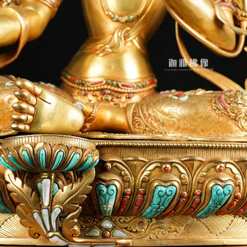 这是一尊来自释迦族的绿度母,尊贵的宫廷气派,鬼斧神工的镶嵌与锤揲技艺,登风造极的鎏金光泽,则把佛教造像的华美瑰丽推向了高潮。绿度母的宝冠像圣洁的布达拉宫一样高低错落,层次分明。其上的宝石如清澈的湖水星罗棋布,顺势而下,滴落在绿度母的臂弯里,滴落在绿度母的裙摆上。脚踝上飞溅起缭绕的云雾,那是飞扬在她身边两侧的帛带,翻卷舞动,美轮美奂,富丽的衣饰使绿度母浸染了尼泊尔手工佛像的优雅特质。绿度母面相饱满方正,五官刻画清晰,棱角分明,眉间饰以白毫,双目俯视,温和慈祥。