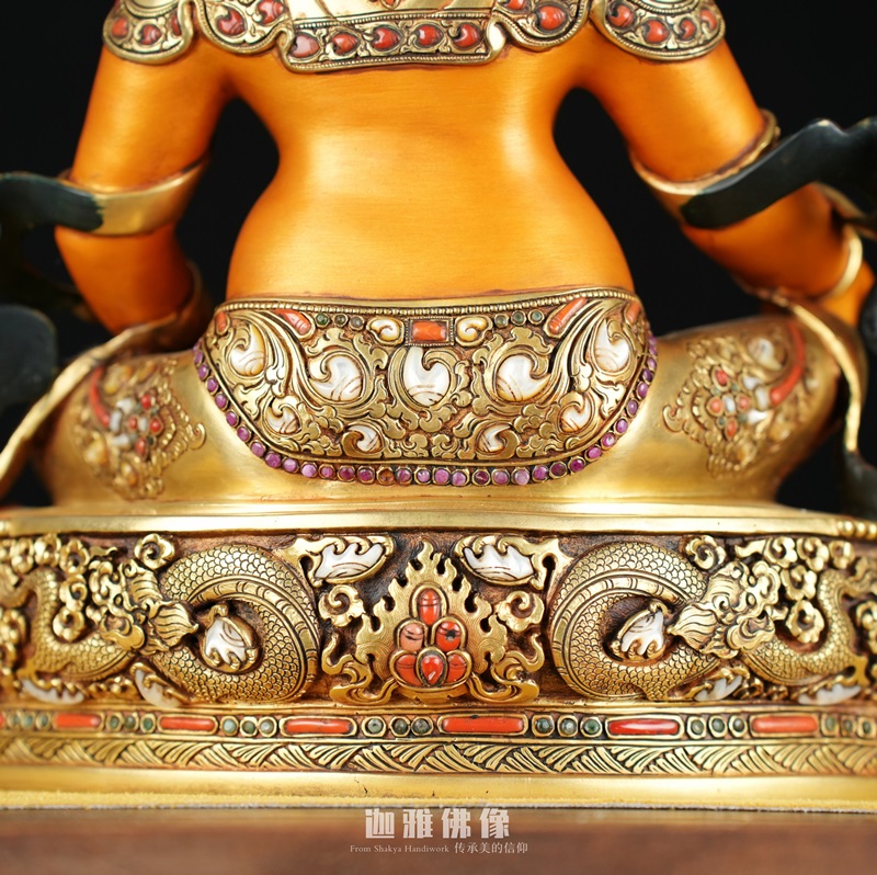 本尊鎏金彩绘黄财神是迦雅工艺师2023年的新作。相较于同尺寸的其它黄财神作品,本尊黄财神的身体部分采用了黄色矿物颜料彩绘,以表达黄财神“身黄色”的形象特质。此外本尊黄财神虽然仅一尺高度,但簪刻和镶嵌的工艺细节做的十分到位,头顶宝冠簪刻分明,配以红珊瑚宝石镶嵌,质感十足。而簪刻开脸搭配细腻的彩绘,并独具匠心的采用了纯银镶嵌眼睛,更使财神威严具足。整个开脸给人以活灵活现的逼真感,可见工艺师傅对财神面容的感觉把握非常到位,令人十分赞叹。