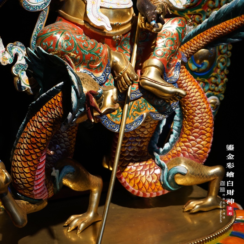 财神右腿屈左腿微伸,以龙为坐骑,具足善福的姿态。这尊的优秀之处在于其精致的錾刻的工艺,不论财神的衣裙,还是龙坐骑,錾刻的细致到位,以至于我们可以清晰的看出神龙每一个鳞片,都自然有序。其一脚悬空,回头后望,仿佛即将飞跃之势。背光和莲花底座以彩绘为主,我们工艺师极擅长做彩绘工艺,通常来说都要先鎏金,再上色,作品呈现出的效果,既饱满鲜亮,有犹存时间久,不会掉色褪色。